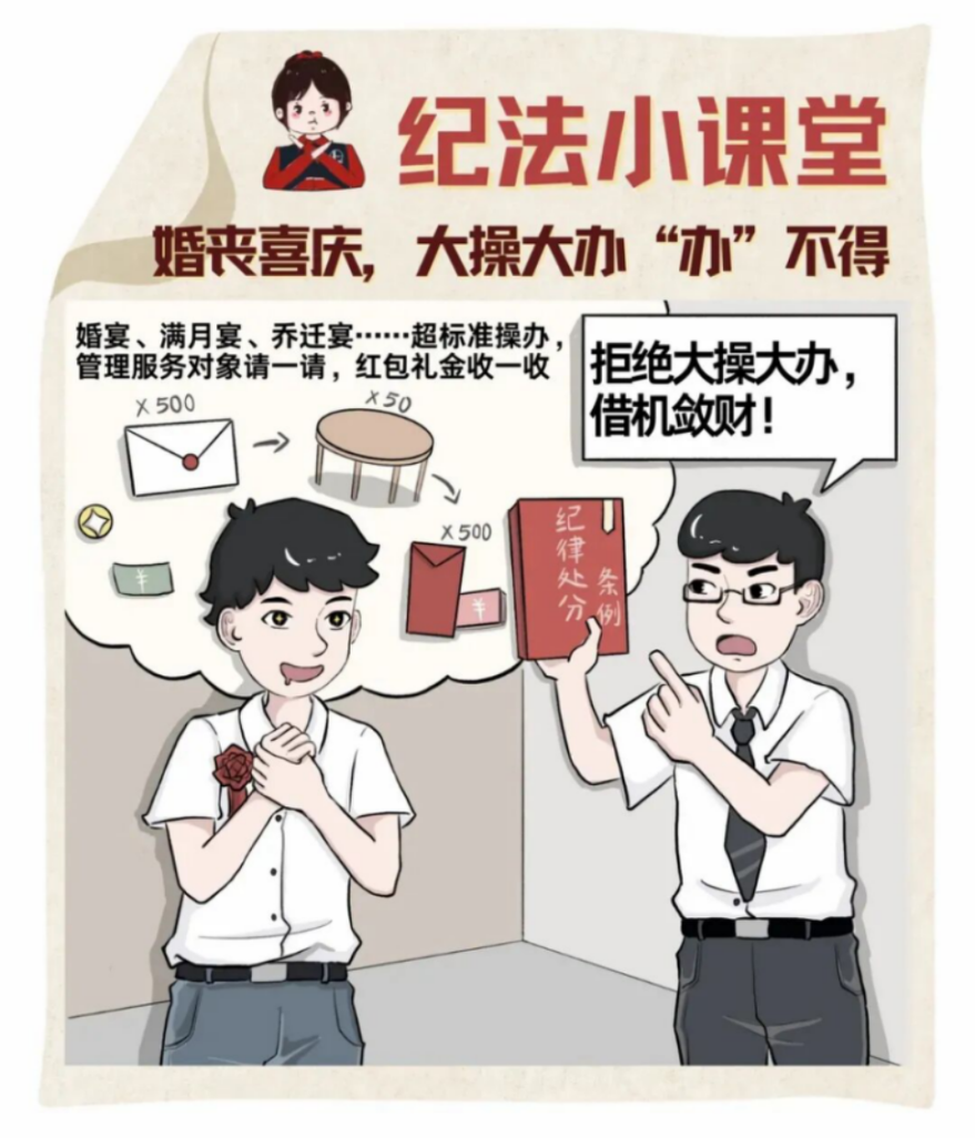 操办婚丧喜庆事宜是人之常情,但要明界限、守底线,在规定范围内以适当的形式表达对亲友的感情,应坚持尚俭戒奢、勤俭节约,不可利用婚丧喜庆事宜大操大办或借机敛财。